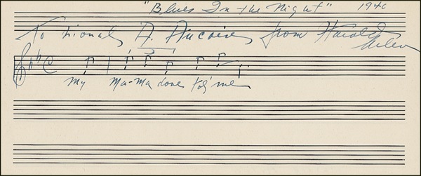 Distinguished American composer (1905–1986) best known for his songs for the film The Wizard of Oz. Vintage AMQS in ink, approximately two measures of the Academy Award–nominated title song from “Blues in the Night” on a cream 8.5 x 3.5 slip of manuscript paper, signed and inscribed “To Lionel A. Aucoin from Harold Arlen, 1940.” In fine condition. R&R COA.