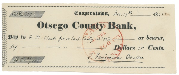 American writer (1789–1851) best known for his series of Leatherstocking Tales and the novel Last of the Mohicans. Bank check, 6 x 2.5, filled out and signed by Cooper, payable to A. H. Clark for $6.25, December 17, 1844. Small tear to top edge and usual bank stamp to “J. Fenimore” (not affecting legibility), otherwise fine, crisp, bright condition. R&R COA.