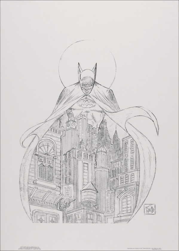 Color limited edition 22 x 30 lithograph entitled Night Vigil Over Gotham, numbered #AP 80/95, signed in pencil by Kane. Accompanied by an uncommon unsigned copy of Kane’s original pencil sketch for the litho image, which were included with the first team press collector’s editions. Rolled and in fine condition, with some dings and creases to lower right corner. R&R COA.