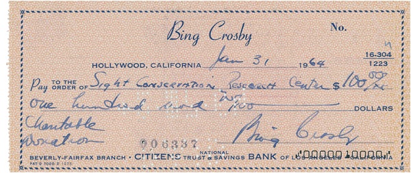 Personal check, 6.25 x 2.5, filled out and signed by Crosby, payable to Sight Conservation Research Center for $100.00, January 31, 1964. Staple holes and punch cancellations (away from signature), otherwise fine condition. R&R COA.