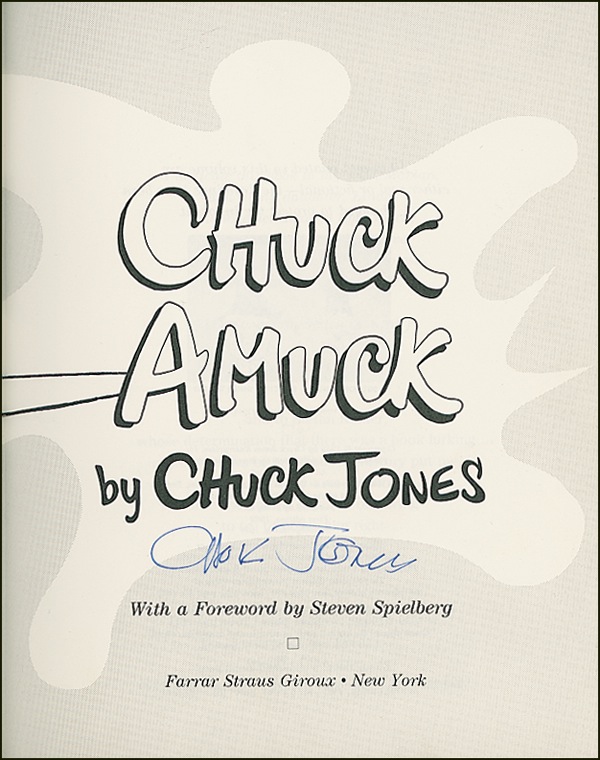 American animator, cartoon artist, screenwriter, producer, and director of animated films, most memorably of Looney Tunes and Merrie Melodies shorts for the Warner Brothers cartoon studio. He directed many of the classic short animated cartoons starring Bugs Bunny, Daffy Duck, the Road Runner & Wile E. Coyote, Pepé Le Pew and the other Warner’s characters. Signed book: Chuck Amuck. First edition, later printing. NY: Farrar Strauss Giroux, 1989. Hardcover with dustjacket, 8.5 x 10.25, 304 pages. Signed in blue felt tip on the title page. In very fine condition. R&R COA.