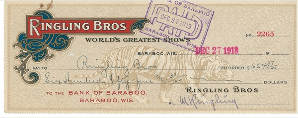 One of the famed Ringling Brothers (1864–1926) who parlayed their circus into a multimillion-dollar entertainment enterprise. Pictorial business check for the Ringling Brothers World’s Greatest Shows, 8.5 x 3.25, filled out in another hand and signed as “Al Ringling,” payable to Ringling Brothers for $654.37, December 27, 1913. Spindle hole and paperclip stain (well away from signature), otherwise fine condition. R&R COA.