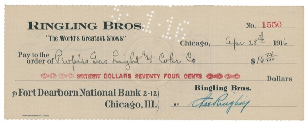One of the famed Ringling Brothers (1863–1926) who parlayed their circus into a multimillion-dollar entertainment enterprise. Business check for the Ringling Brothers World’s Greatest Shows, 8.5 x 3.25, filled out in another hand and signed as “Chas. Ringling,” payable to Peoples Gas Light & Coke Company for $16.74, April 28, 1913. Punch cancellations (away from signature) and light vertical fold through first name, otherwise fine condition. R&R COA.