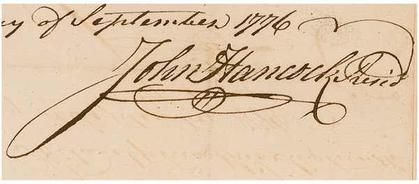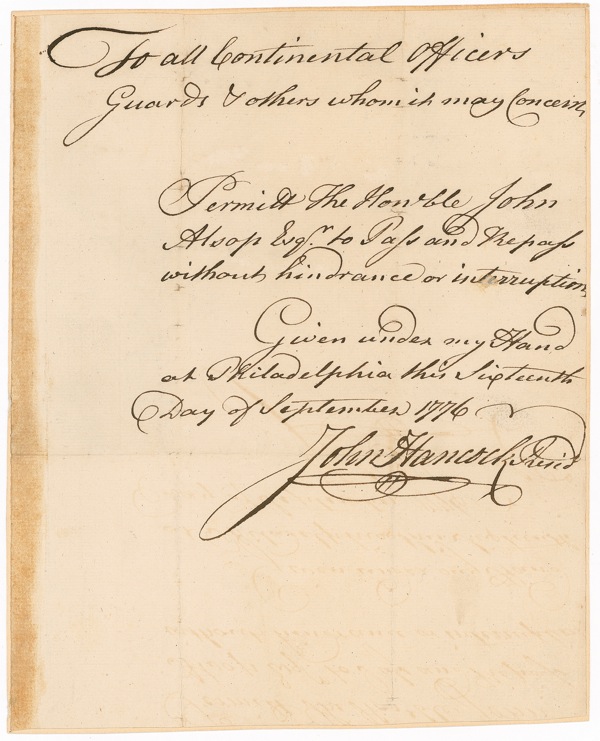Outstanding ADS, boldly signed “John Hancock, Prsidt.” [of the Continental Congress], one page, 8 x 10, September 16, 1776. In full: “To all Continental Officers, Guards & others whom it may concern: Permit the Honble. John Alsop Esqr. to Pass and Repass without hindrance or interruption. Given under my Hand at Philadelphia this Sixteenth Day of September 1776.” Alsop (1724–1794) was a prominent New York merchant who served as one of his state’s delegates to the Continental Congress from 1774 to 1776. At the time of writing, Alsop, an ardent and active supporter of the Revolutionary cause, was traveling frequently between Philadelphia and New York City, functioning as an agent (through his own business) to procure supplies, particularly gunpowder, for the Continental Army. In addition to his role as a supplier, Alsop also made notable contributions both in the recruitment of troops and in his efforts to obtain housing for them. The document is partly affixed to slightly larger card. Accompanied by two 1993 TLS from noted autograph expert Charles Hamilton attesting to the item’s authenticity. Intersecting folds (horizontal fold, with tiny, easily restorable separations through signature, not affecting legibility in the least; a few partial separations elsewhere), very mild wrinkling and soiling, very subtle “ghosting” of text from folding of sheet, and light staining along left margin (not affecting any text), otherwise fine condition. Most of the faults are minor and are mentioned only for strictest accuracy befitting an item of such importance—for the exceptional large signature, overall handsome appearance, significant association, and all-important, coveted date of 1776 grant the present item the most exclusive cachet among documents from this most prominent of Signers! Auction LOA John Reznikoff/PSA/DNA and R&R COA.