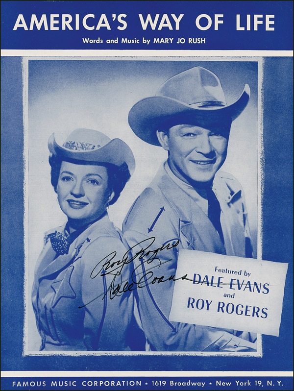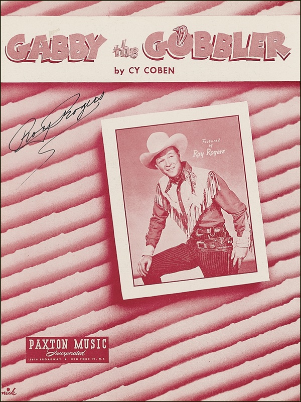 Two pieces of sheet music: America’s Way of Life, signed in black felt tip by Rogers and Evans, and Gabby the Gobbler, signed in black felt tip by Rogers only. In fine condition. R&R COA.