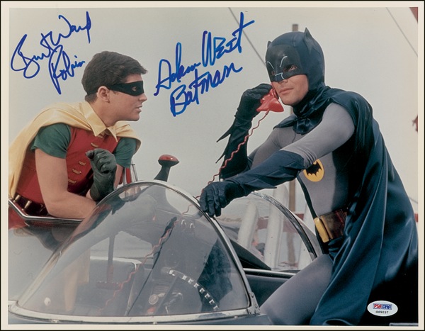 Color satin-finish 14 x 11 photo of Batman talking to Commissioner Gordon via the Batmobile, signed in blue felt tip by Adam West and Burt Ward, both adding their character names. Accompanied by a certificate of authenticity from PSA/DNA. In very fine condition, with a PSA/DNA authentication label affixed to bottom. R&R COA.