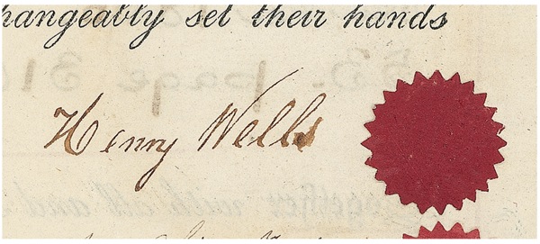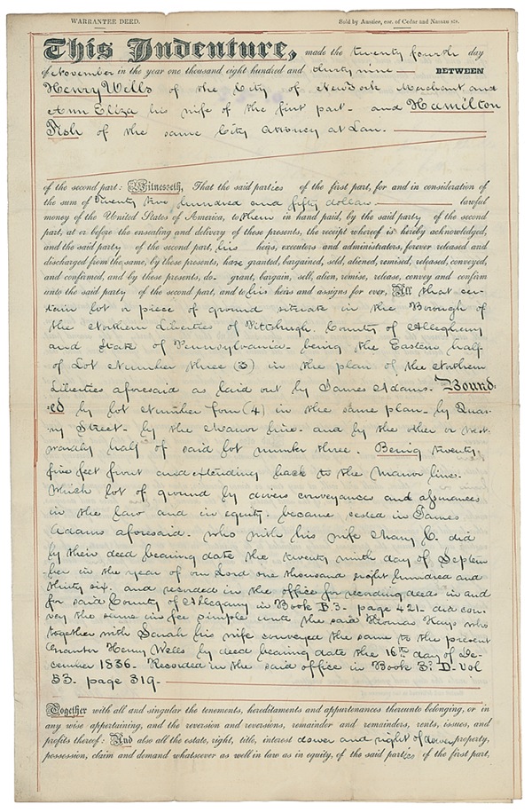 President of the Wells-Fargo Express Company (1805–1878), which took a leading role in the commercial development of the American west in the nineteenth century. Partly printed DS, three pages on two adjoining sheets, 10 x 15.5, November 24, 1839. A quitclaim deed for a parcel of land in Pittsburgh between Wells and Hamilton Fish (1808–1893), the future U.S. Secretary of State. Countersigned by Wells’s wife, Ann Eliza Wells. In very good condition, with intersecting folds, scattered light soiling and toning, and handling wear and wrinkling (touching signature but not affecting legibility). R&R COA.