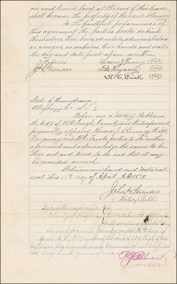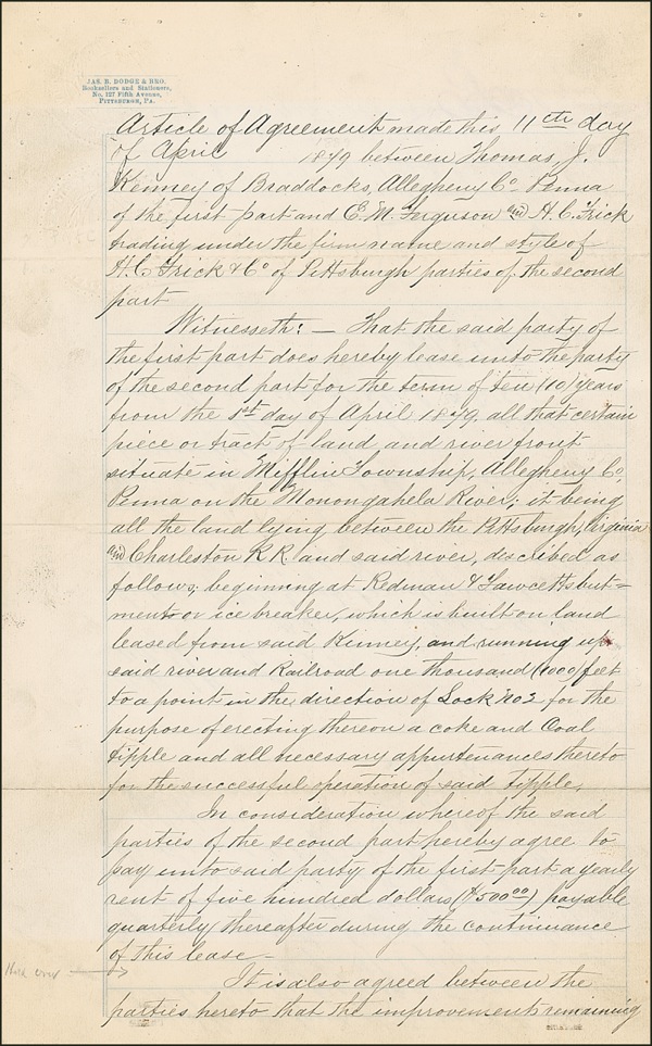 Prominent American industrialist (1849–1919) who served as president of U.S. Steel and assembled a world-class art collection now housed in the New York museum that bears his name. Manuscript DS, signed “H. C. Frick,” one lightly lined page both sides, 8.5 x 13.75, April 11, 1879. A lease between Thomas J. Kenney and H. C. Frick & Co. for a parcel of land in Mifflin Township, Pennsylvania “for the purpose of erecting thereon a coke and coal tipple and all necessary appurtenances thereto for the successful operation of said tipple.” Countersigned by several others. Mild soiling and handling wear (including marginal pinholes), otherwise fine condition.