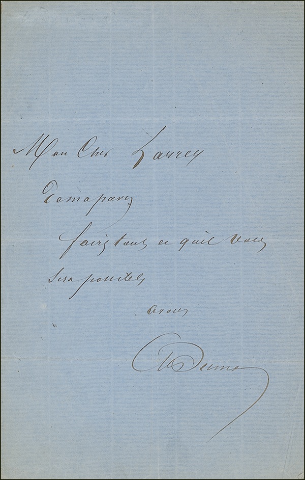 Distinguished French novelist (1802–1870) of such historical classics as The Count of Monte Cristo, The Three Musketeers, and The Man in the Iron Mask. ALS in French, signed “Al. Dumas,” one page, 5 x 8, no date. Dumas writes to “My dear Larrey.” In full (translated): “Do all that it is possible to do.” Intersecting folds (touching signature), wrinkles, and a few small edge tears, otherwise fine condition. R&R COA.