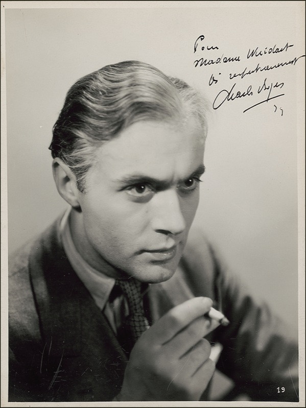Vintage pearl-finish 6.75 x 9 photo of Boyer holding a cigarette, signed and inscribed in fountain pen in French and signed “Charles Boyer 39.” In fine condition, with scattered light surface marks and a paperclip impression to top left. R&R COA.