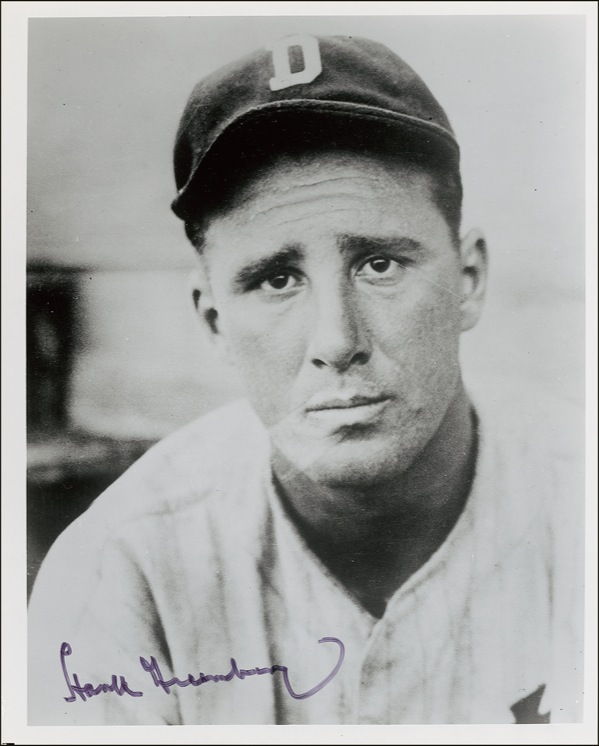 Glossy 8 x 10 head-and-shoulders photo of Greenberg in his Detroit uniform, signed in black felt tip. In very fine condition. Auction LOA Steve Grad/PSA/DNA and R&R COA.