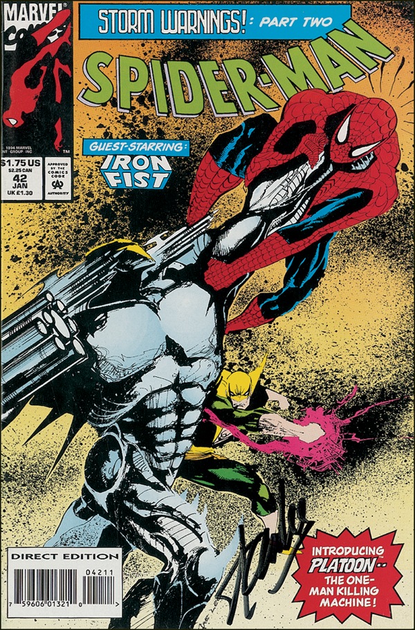 Two different Spider-Man comic books, each signed on the front cover in black felt tip by Lee. In fine condition, with a bit of light handling wear. R&R COA.