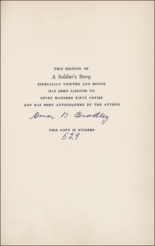 Signed book: A Soldier’s Story. First edition, first printing. NY: Henry Holt, 1951. Hardcover, 6.25 x 9.25, 618 pages. Signed on the limitations page in black ink, indicating this is a limited edition of 750 copies, this being number 529, and also signed and inscribed on the title page in blue ballpoint by Bradley, as well as by his wife. In fine condition. R&R COA.