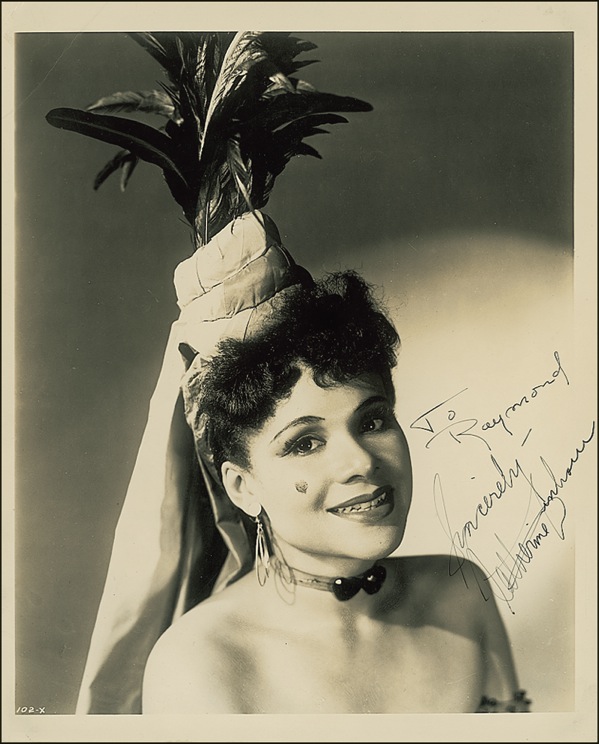 African-American dancer and choreographer (1909–2006) best known as founder and director of the dance company which bore her name and for her appearances in such films as Star Spangled Rhythm and Stormy Weather. Vintage glossy 8 x 10 photo, signed and inscribed in fountain pen, “To Raymond, Sincerely, Katherine Dunham.” In fine condition, with a few creases, dings, and surface marks. R&R COA.