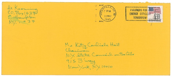 Dutch-born American painter (1904–1997) who was was of the seminal figures of the Abstract Expressionist movement. Hand-addressed and signed mailing envelope , 9.5 x 4.25, addressed by de Kooning to Kitty Carlisle Hart, signed in the return address area in the top left, “de Kooning,” adding his New York mailing address. Envelope is postmarked May 22, 1985. In fine condition, with water spot to lower portion of return address, not affecting signature. R&R COA.