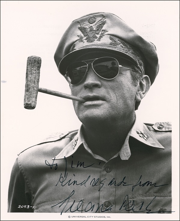 Glossy 8 x 10 promotional photo of Peck as General Douglas MacArthur, signed and inscribed in black felt tip “To Jim, Kindest regards from Gregory Peck.” Scattered light creases and surface marks, a few edge dings, and a couple small tears to top edge, otherwise fine condition. R&R COA.