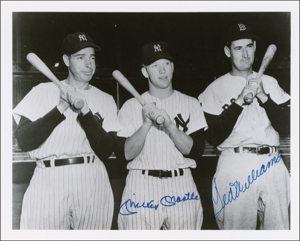 Glossy 10 x 8 photo of Mickey Mantle, Ted Williams, and Joe DiMaggio posing together with their bats on their shoulders, signed in blue felt tip by Mickey Mantle and Ted Williams. In very fine condition. Auction LOA Steve Grad/PSA/DNA and R&R COA.