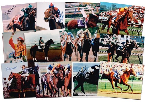 Twelve color glossy and satin-finish 8 x 10 and 10 x 8 photos of horses and their respective jockeys, each signed in felt tip by the respective jockey pictured. Signers are: Ron Turcotte (Secretariat), Mike Smith (Skip Away), Mike Smith (Azeri), Bill Mott (Cigar), Victor Espinoza (Spain), John Velasquez (Harlan’s Holiday), David Flores (Action This Day), Robbie Albarado (Mineshaft), Kent Desormeaux (ins) (Fusiachi Pegasus), Ronnie Franklin (Spectacular Bid), Craig Perret (Unbridled), and Mike Smith (Holy Bull). In fine condition. R&R COA.
