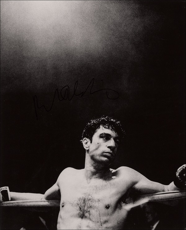 Satin-finish 16 x 20 photo of DeNiro as a battered Jake LaMotta in Raging Bull, signed in black felt tip. In fine condition. R&R COA.