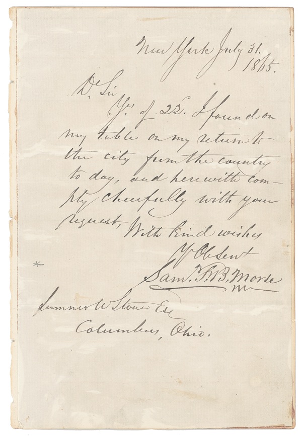 American artist and inventor (1791–1872) whose development of the telegraph revolutionized communication—and indeed, society as a whole—and represented a crucial step toward such later innovations as the telephone. ALS signed “Saml. F. B. Morse,” one page, 5 x 7.5, July 31, 1865. Morse writes to Sumner W. Stone in Columbus. In full: “Yrs. of 22. I found on my table on my return to the city from the country today, and herewith comply cheerfully with your request….” In very good condition, with letter affixed to slightly larger sheet, faint discoloration from glue staining, and a touch of mild soiling and handling wear. The writing is clear and dark throughout. Auction LOA John Reznikoff/PSA/DNA and R&R COA.