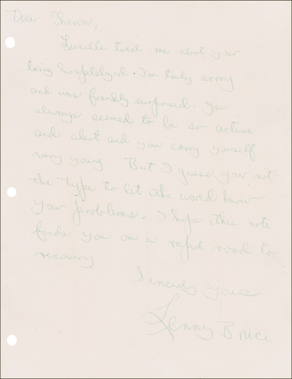 Pioneering American stand-up comic (1925–1966) whose frank, sometimes “obscene” commentary on a variety of taboo subjects made him one of the most controversial yet popular performers of the 1950s and 1960s. He died of a morphine overdose at the age of 40. ALS, one page, 8.5 x 11, no date [postmarked October 13, 1958]. Bruce writes to Theron E. Griffin in Mexico. In full: “Lucille told me about your being hospitalized. I’m truly sorry and was frankly surprised. You always seemed to be so active and alert and you carry yourself very young. But I guess your [sic] not the type to let the world know your problems. I hope this note finds you on a rapid road to recovery….” Accompanied by the original mailing envelope addressed in Bruce’s hand. Intersecting mailing folds (slightly touching initials) and ink a shade light but fully legible, otherwise fine, clean condition. R&R COA.
