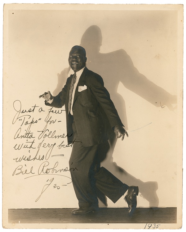 American entertainer (1878–1949), nicknamed “Bojangles,” who was one of the best-known dancer-actors of Hollywood’s Golden Age. He often appeared opposite Shirley Temple in the 1930s. Vintage matte-finish 8 x 10 photo, signed and inscribed in ink “Just a few ‘taps’ for Anita Vollmer with very best wishes—Bill Robinson, 1935.” In very good condition, with date notation in bottom margin, scattered mild soiling and a few surface marks, small puncture to sleeve of shadow, tiny spot of skinning near bottom edge, and light silvering to dark portions. The writing is clear and dark. R&R COA.