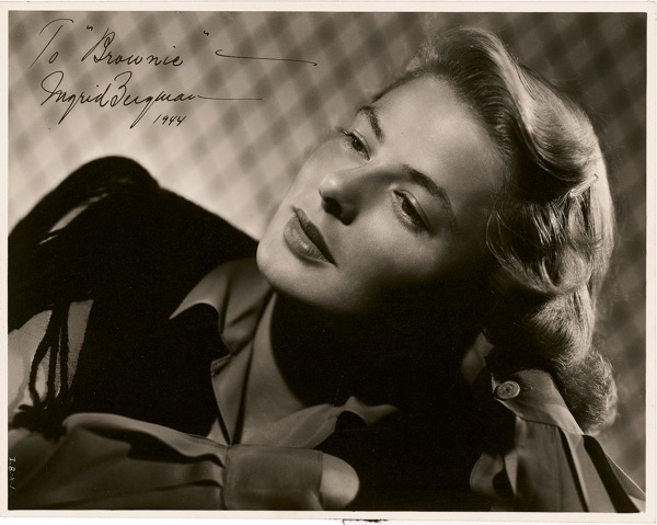 Gorgeous vintage matte-finish 9.5 x 7.5 photo, signed and inscribed in ink, “To ‘Brownie,’ Ingrid Bergman, 1944.” A few very subtle surface marks, otherwise very fine, clean condition. R&R COA.