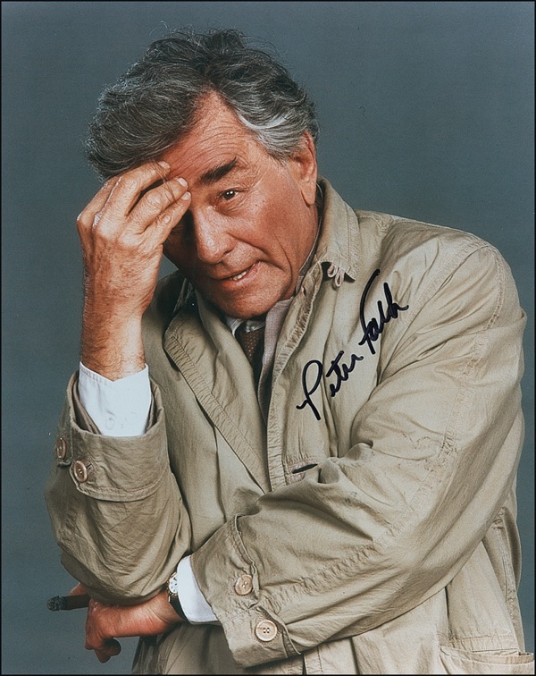 Color glossy 8 x 10 photo of Falk as Inspector Columbo, signed in black felt tip. In very fine condition. R&R COA.