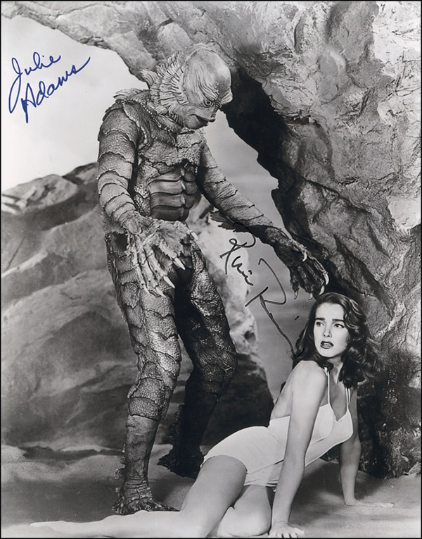 Glossy 11 x 14 photo of the creature and damsel in distress, signed in blue felt tip by Julie Adams and in black felt tip by Ricou Browning. In very fine condition. R&R COA.