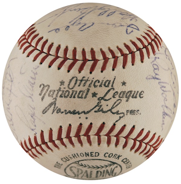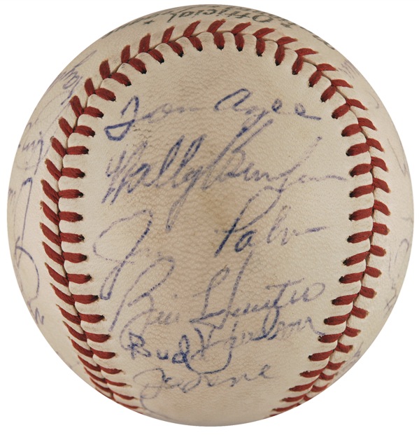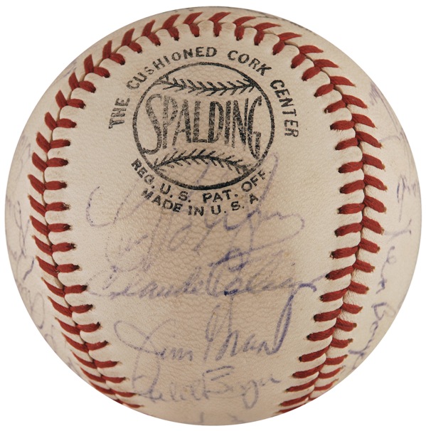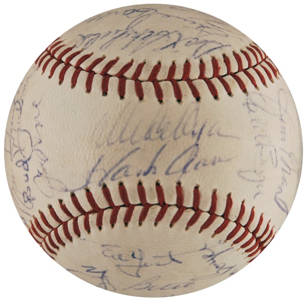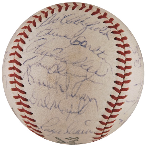 Official Spalding National League baseball signed in ballpoint by 25 American and National League players, highlighted by side panel signatures of Roger Maris, Brooks Robinson, Yogi Berra, Jim Palmer, and Steve Carlton, and a sweet spot signature of Hank Aaron. Other signers include: Joe Torre, Bud Harrelson, Tommy Agee, Dick Schofield, Ed Yost, and Bill Hunter. Accompanied by a letter of authenticity from PSA/DNA. In fine condition, with a bit of scattered light toning and soiling, and all signatures a shade or two light, but completely legible. Auction LOA Steve Grad/PSA/DNA and R&R COA.