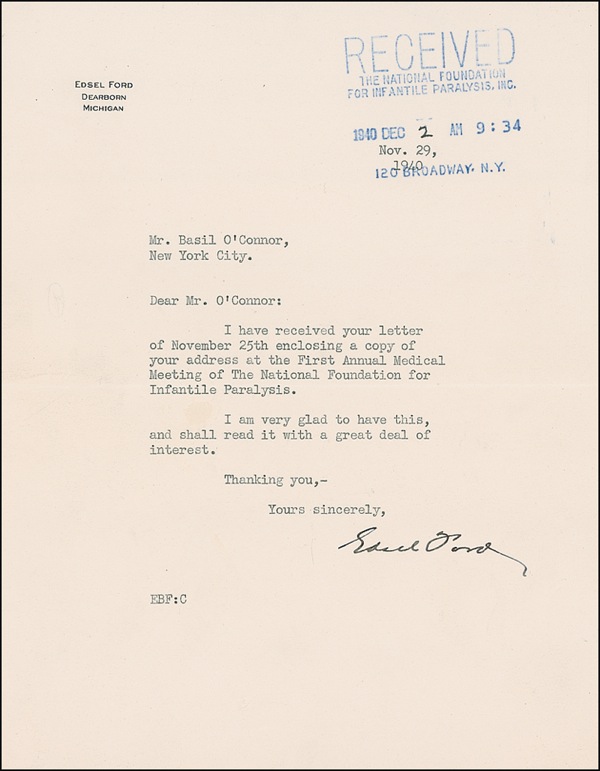 Son of auto pioneer Henry Ford (1893–1943) who succeeded his father as head of the Ford Motor Company. His name will forever be associated with the eponymous 1958–60 Ford model that went down as one of the greatest and most costly failures in automotive history. TLS, one page, 6.75 x 8.75, personal letterhead, December 2, 1940. Ford writes to Basil O’Connor, FDR’s former law partner, in New York City. In part: “I have received your letter … enclosing a copy of your address at the First Annual Medical Meeting of the National Foundation for Infantile Paralysis. I am very glad to have this, and I shall read it with a great deal of interest….” Mild handling wear, otherwise fine condition. R&R COA.