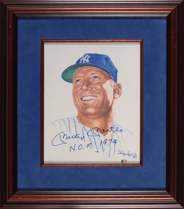 Color 8 x 10 Ron Lewis print of Mantle in his Yankee pinstripes, signed in blue felt tip, “Mickey Mantle, H.O.F. 1974.” Accompanied by a letter of authenticity from James Spence. Suede matted and framed to an overall size of 14.5 x 16.75. In very fine condition. Auction LOA Steve Grad/PSA/DNA and R&R COA.