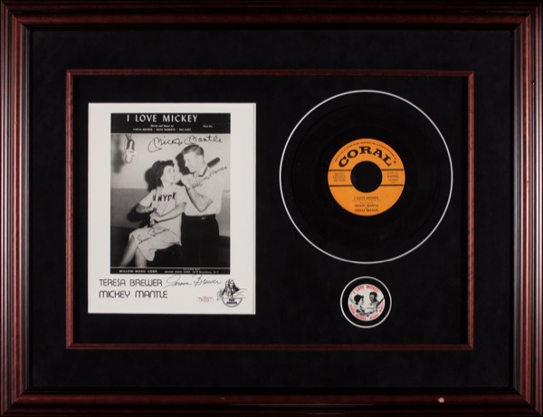 Glossy 8 x 10 promotional photo of the cover of the sheet music for I Love Mickey by Teresa Brewer, signed in black felt tip by Mickey Mantle and Teresa Brewer. Double suede matted and framed with an original record of the song and a Mantle and Brewer commemorative pin, to an overall size of 25.5 x 19.5. In very fine condition. Auction LOA Steve Grad/PSA/DNA and R&R COA. Oversized.