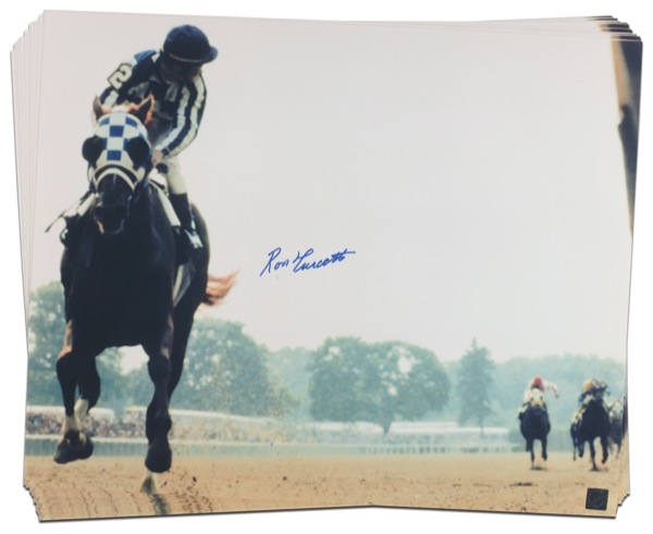 Twelve identical color satin-finish 20 x 16 photos of Turcotte looking over his shoulder as he wins the 1973 Belmont Stakes atop Secretariat, each signed in blue felt tip. Accompanied by a photo taken at time of private signing. In very fine condition. Auction LOA Steve Grad/PSA/DNA and R&R COA.