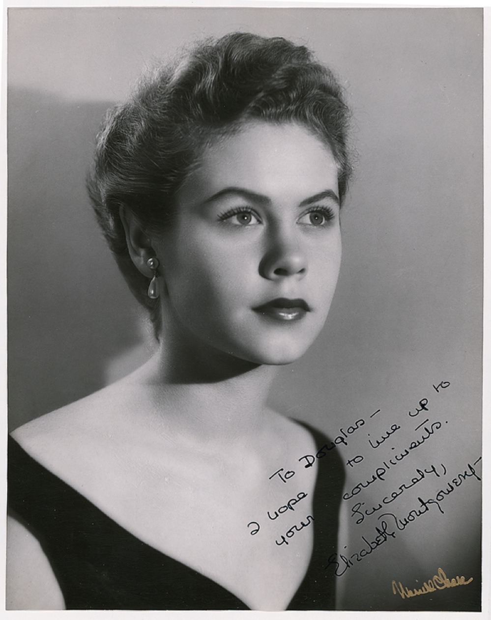 Vintage glossy 7.25 x 9 photo, signed and inscribed in black ink “To Douglas—I hope to live up to your compliments. Sincerely, Elizabeth Montgomery.” Carefully trimmed edges, and a few light bends and creases, otherwise fine condition. RRAuction COA.