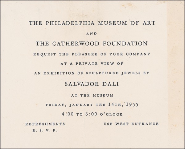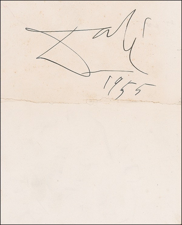 Large, bold ink signature, “Dali, 1955,” on the reverse of a 6.5 x 5.25 printed invitation for an exhibition of sculptured jewels by Dali at the Philadelphia Museum of Art on January 14, 1955. In very good condition, with heavy crease just touching bottom edge of date, light toning to printed side, and faint spotting and soiling to signature side. R&R COA.
