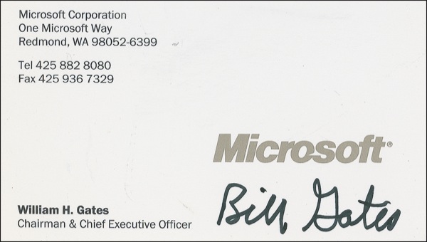 Co- founder and former CEO of Microsoft and the richest man in the world. Bill Gates’ Microsoft business card, 3.5 x 2, signed in black felt tip in the lower right corner. Accompanied by a letter from Microsoft, acknowledging Gates’s signature. In very fine condition. R&R COA.