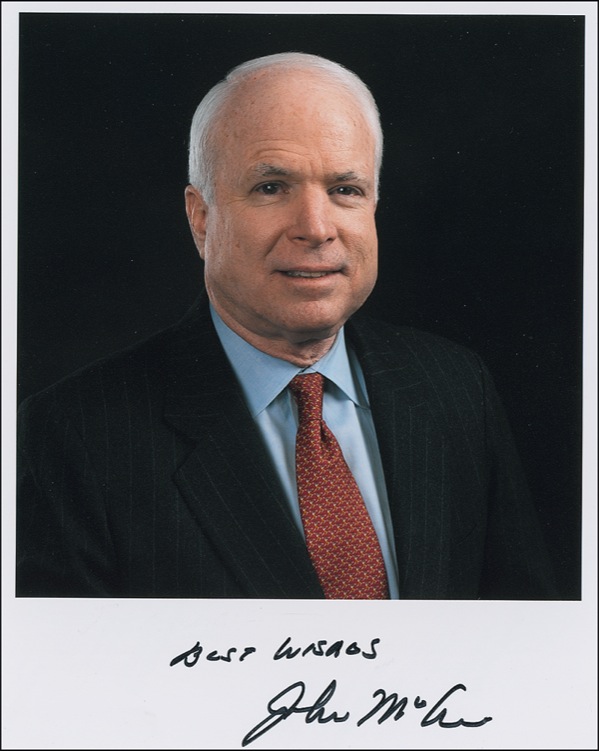 Color satin-finish 8 x 10 photo, signed in the lower border in black felt tip, “Best wishes, John McCain.” In very fine condition. R&R COA.