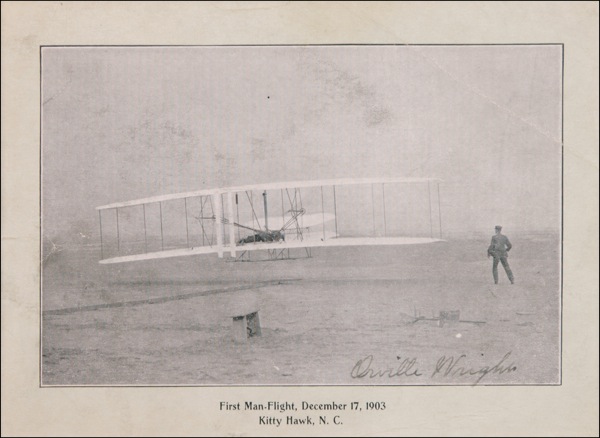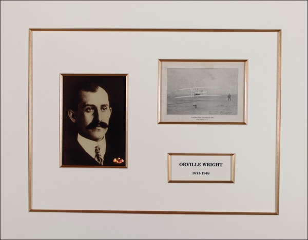Historic 5.5 x 4 cardstock photo of the Wright Brothers’ first flight, signed in fountain pen at lower right, “Orville Wright.” Double gilt-matted and framed with a portrait of Wright and a small name caption, to an overall size of 22 x 17.5. In very good condition, with a diagonal crease to top right, creasing to left side, and a few surface marks. Auction LOA John Reznikoff/PSA/DNA and R&R COA.