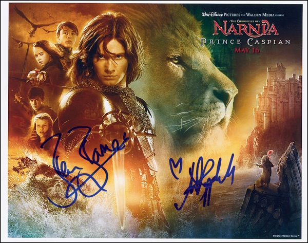 Color satin-finish 12 x 8 composite photo for the latest installation of the Chronicles of Narnia, signed in-person in blue felt tip by Ben Barnes and Anna Popplewell. In very fine condition. R&R COA.