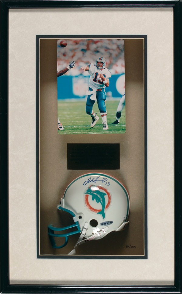 Official limited edition Riddell Miami Dolphins mini-football helmet, 81/500, honoring Marino surpassing the 50,000 yard passing mark, signed in blue felt tip on the side. Shadow-boxed and framed with a color 5 x 7 photo of Marino breaking the record, to an overall size of 13 x 21.5. Accompanied by a certificate of authenticity from Upper Deck. In very fine condition. Auction LOA Steve Grad/PSA/DNA and R&R COA.
