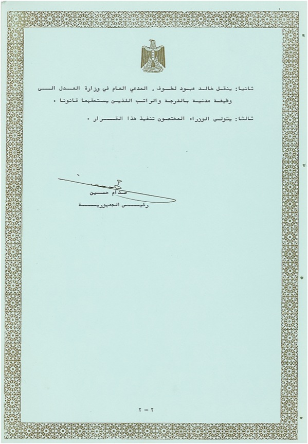 DS, in Arabic, one page, 8.25 x 12, circa 1990s. An untranslated typed document bearing a printed eagle with shield device at the top of the page, signed in black ink. Small file holes to right margin, otherwise very fine, clean condition. R&R COA.