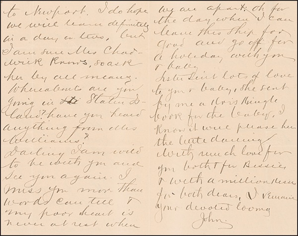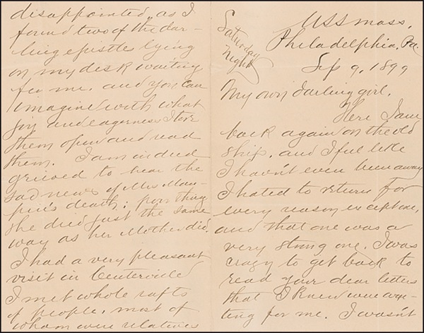 Commandant of the U.S. Marine Corps (1867–1942) who earned the sobriquet “Greatest of All Leathernecks” for his 40 years of military service, particularly during the Spanish-American War and World War I. ALS signed “John,” four pages both sides, 5 x 8, September 9, 1899. Lejeune writes to his wife from aboard the U.S.S. Massachusetts. In part: “Here I am back again on the old ship…. I am indeed grieved to hear the sad news of Mrs. M—’s death. Poor thing she died just the same way as her mother did. I had a very pleasant visit in Centerville. I met whole rafts of people…. We are to leave on the 15th & everyone thinks we will go to New York & not to Newport…. Oh for the day when I can leave this ship for good and go off for a holiday with you & baby….” Intersecting folds, otherwise fine condition. R&R COA.