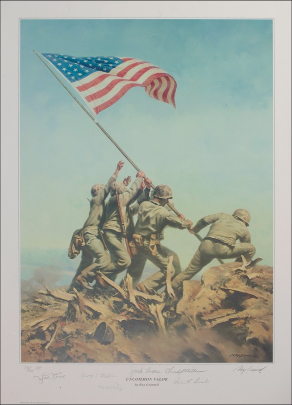 Limited edition color print titled “Uncommon Valor,” depicting the flag-raising on Iwo Jima, numbered AP 13/100, 20 x 28, signed in pencil by Marine Corps MOH recipients Joe Foss, George Wahlen, Mitchell Paige, Jack Lucas, Hershel Williams, Robert E. Bush, and Everett Pope, and by artist Roy Grinnell. In very fine condition. Rolled. R&R COA.