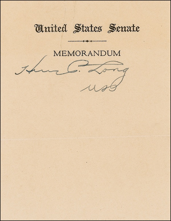 Senator best known for his Share-the-Wealth national program; he was assassinated in 1935. Vintage ink signature, “Huey P. Long,” on an off-white 4 x 5.25 sheet of United States Senate memorandum stationery. Accompanied by the original mailing envelope, postmarked July 6, 1935 (just two months before his assassination), and a Congressional Record, which accompanied the signature. In fine condition, with paperclip impression to top, and a light shade of overall toning. R&R COA.