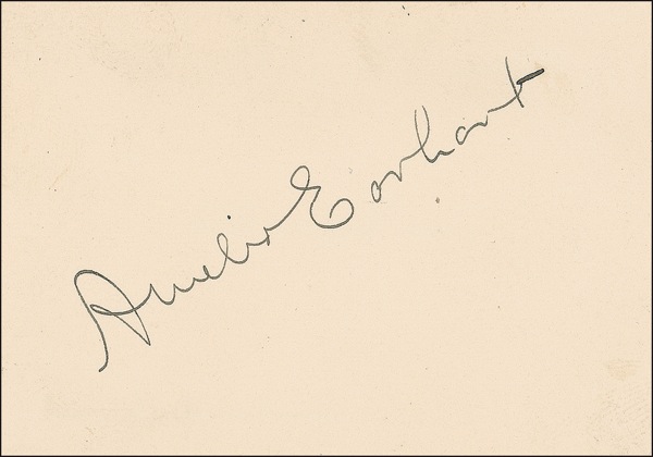 Perfect fountain pen signature, “Amelia Earhart,” on an off-white 3 x 2 card. In very fine condition. R&R COA.