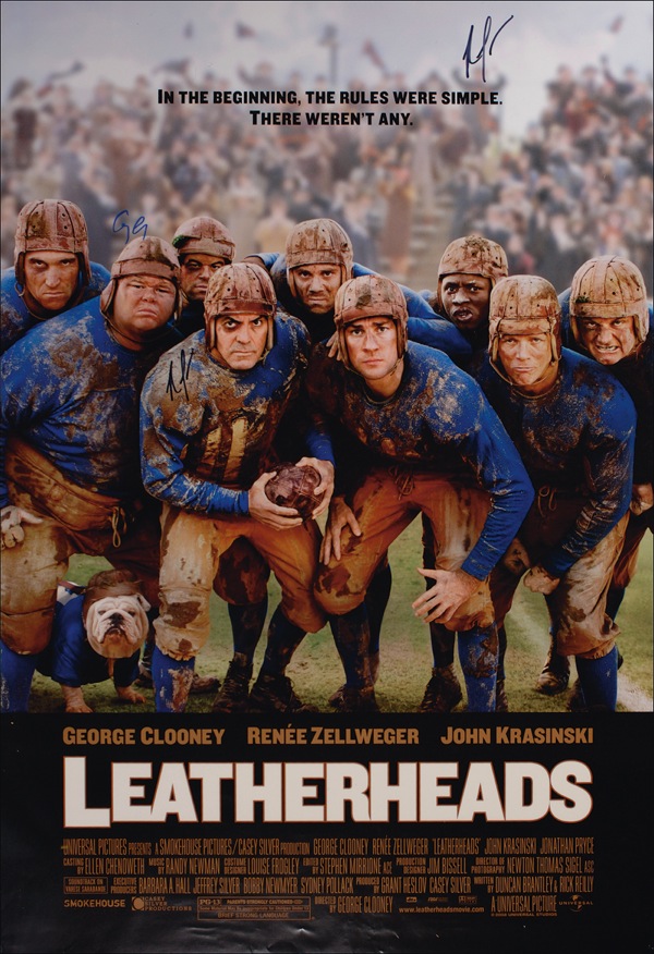Color 27 x 40 one sheet movie poster for Leatherheads, signed in-person at a Whistle Stop media tour in North Carolina in blue felt tip by George Clooney and in black felt tip by Renee Zellwegger. Accompanied by four candid photos taken at the event. Rolled and in fine condition, wih some scattered light edge dings. R&R COA.