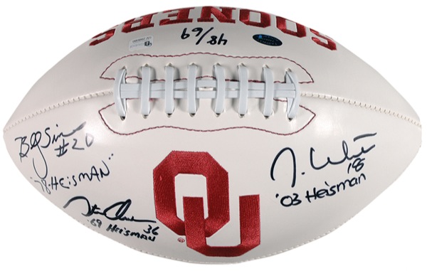 Official limited edition Rawlings Oklahoma University commemorative football, #48/69, signed in felt tip on the white side panel by Oklahoma Heisman winners Steve Owens, Billy Sims, and Jason White, each adding the year of their award. Accompanied by a composite photo taken at time of private signing. In very fine condition. Auction LOA Steve Grad/PSA/DNA and R&R COA.