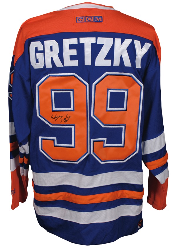 Official CCM replica Edmonton Oilers hockey jersey, with sewn on letters and numbers, signed in felt tip on the number on the back. In very fine condition. Auction LOA Steve Grad/PSA/DNA and R&R COA.