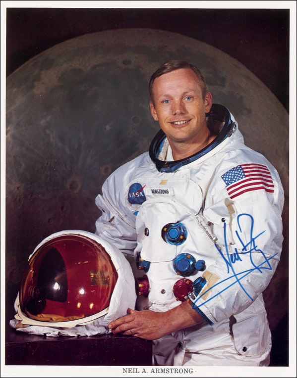 Color 8 x 10 NASA photo of Armstrong posing in his space suit against a lunar background, signed in blue felt tip. In very fine condition. Uninscribed photos of Armstrong represent one of the most coveted and elusive prizes in the entire field of space collecting. R&R COA.